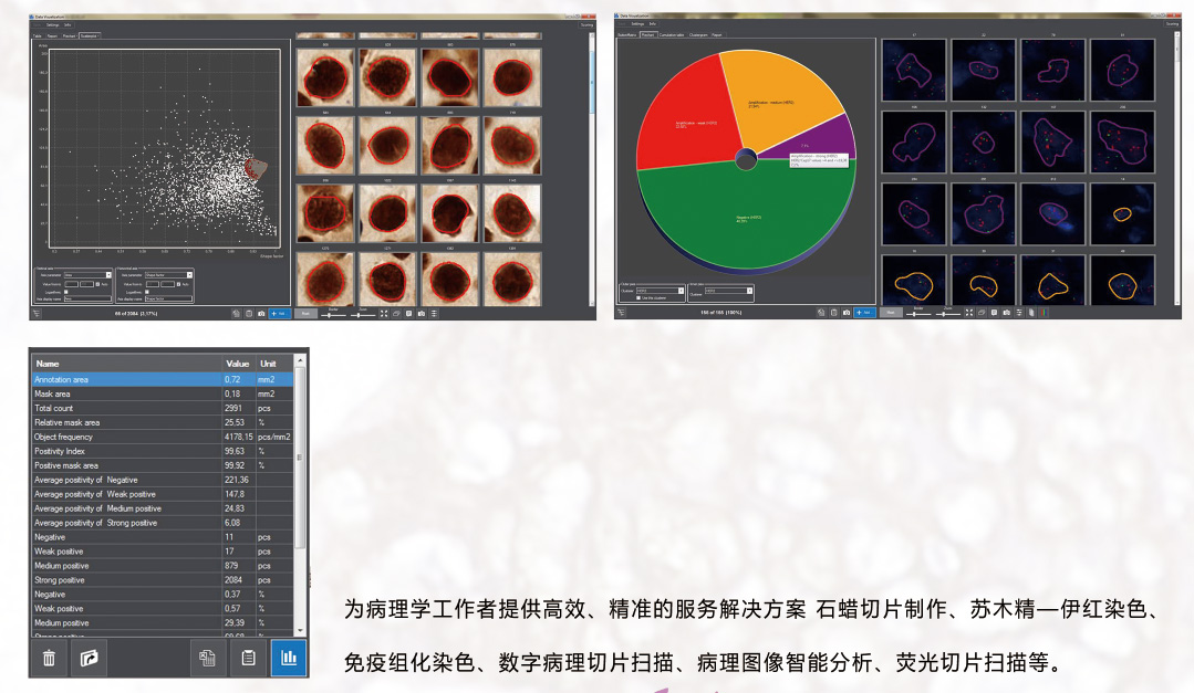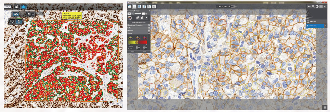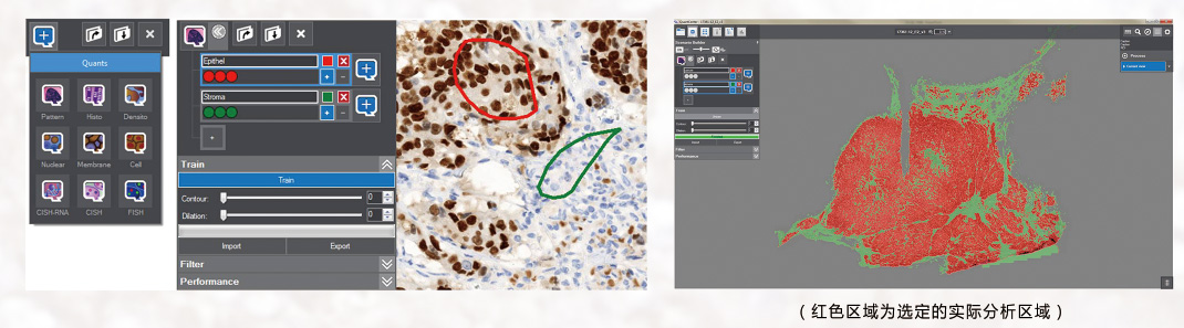 數字病理圖片分析基于全玻片掃描圖片,分析軟件HistoQuant適用于所有染色,基于光密度和色值的彩色圖像分割,并能深度自我學習,多次分析測算后,能快速主動尋找標記陽性區(qū)域。同時還有細胞核分析軟件NuclearQuant,適用于免疫組織化學(ER,PR和Ki67等核染色);細胞膜分析軟件MembraneQuant,適用于免疫組織化學(HER2, EGFR等膜染色);