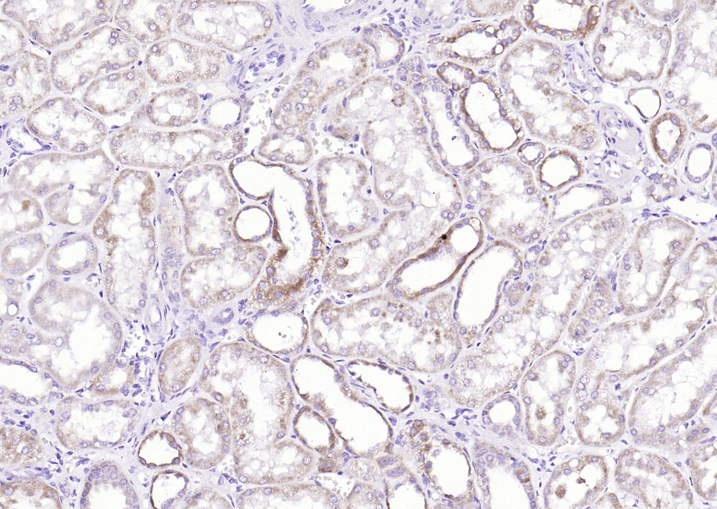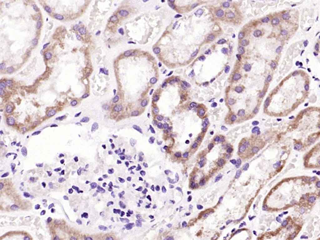 Paraformaldehyde-fixed, paraffin embedded (Human kidney); Antigen retrieval by boiling in sodium citrate buffer (pH6.0) for 15min; Block endogenous peroxidase by 3% hydrogen peroxide for 20 minutes; Blocking buffer (normal goat serum) at 37°C for 30min; Antibody incubation with (alpha 1 Antitrypsin) Polyclonal Antibody, Unconjugated (bs-0096R) at 1:200 overnight at 4°C, followed by operating according to SP Kit(Rabbit) (sp-0023) instructionsand DAB staining.