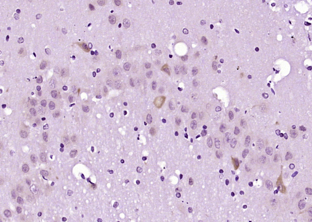 Paraformaldehyde-fixed, paraffin embedded (rat brain tissue); Antigen retrieval by boiling in sodium citrate buffer (pH6.0) for 15min; Block endogenous peroxidase by 3% hydrogen peroxide for 20 minutes; Blocking buffer (normal goat serum) at 37°C for 30min; Antibody incubation with (Ack1) Polyclonal Antibody, Unconjugated (bs-1227R) at 1:200 overnight at 4°C, followed by operating according to SP Kit(Rabbit) (sp-0023) instructionsand DAB staining.