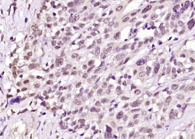 Paraformaldehyde-fixed, paraffin embedded (human colon carcinoma); Antigen retrieval by boiling in sodium citrate buffer (pH6.0) for 15min; Block endogenous peroxidase by 3% hydrogen peroxide for 20 minutes; Blocking buffer (normal goat serum) at 37°C for 30min; Antibody incubation with (Ack1) Polyclonal Antibody, Unconjugated (bs-1227R) at 1:200 overnight at 4°C, followed by operating according to SP Kit(Rabbit) (sp-0023) instructionsand DAB staining.