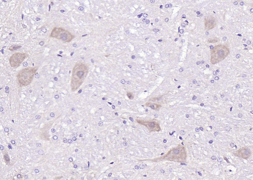 Paraformaldehyde-fixed, paraffin embedded (rat cerebellum); Antigen retrieval by boiling in sodium citrate buffer (pH6.0) for 15min; Block endogenous peroxidase by 3% hydrogen peroxide for 20 minutes; Blocking buffer (normal goat serum) at 37°C for 30min; Antibody incubation with (Neuronal thread protein AD7c-NTP) Polyclonal Antibody, Unconjugated (bs-0046R) at 1:200 overnight at 4°C, followed by operating according to SP Kit(Rabbit) (sp-0023) instructionsand DAB staining.