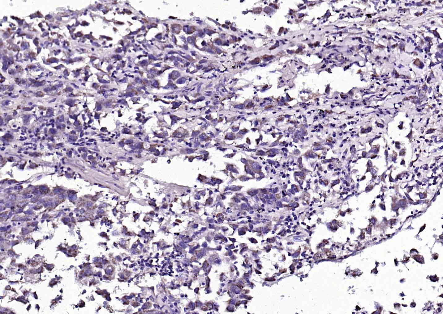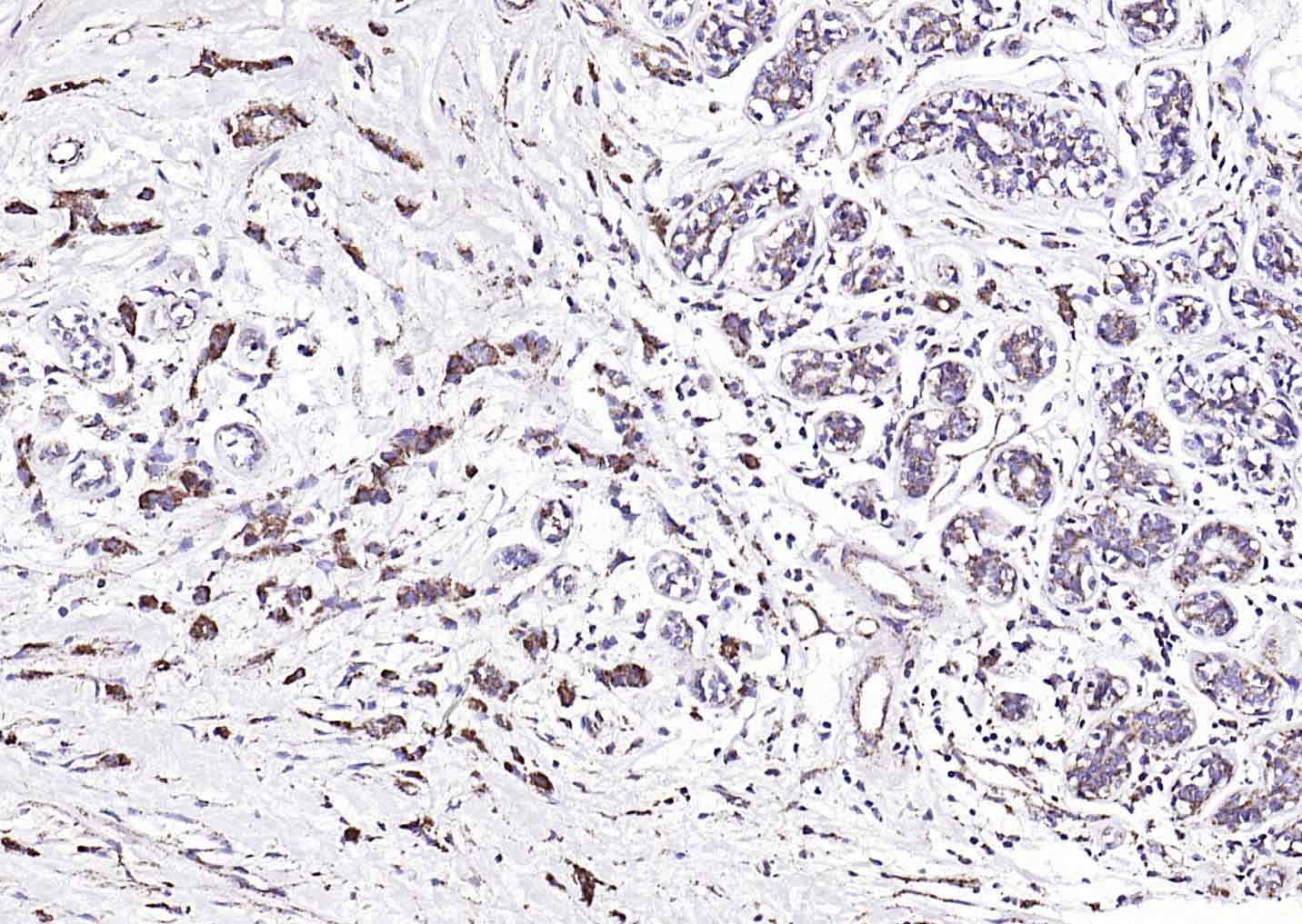 Paraformaldehyde-fixed, paraffin embedded (human lung carcinoma); Antigen retrieval by boiling in sodium citrate buffer (pH6.0) for 15min; Block endogenous peroxidase by 3% hydrogen peroxide for 20 minutes; Blocking buffer (normal goat serum) at 37°C for 30min; Antibody incubation with (Angiopoietin-1) Polyclonal Antibody, Unconjugated (bs-0800R) at 1:200 overnight at 4°C, followed by operating according to SP Kit(Rabbit) (sp-0023) instructionsand DAB staining.
