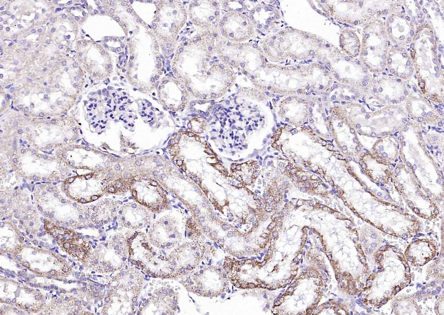 Paraformaldehyde-fixed, paraffin embedded (rat kidney); Antigen retrieval by boiling in sodium citrate buffer (pH6.0) for 15min; Block endogenous peroxidase by 3% hydrogen peroxide for 20 minutes; Blocking buffer (normal goat serum) at 37°C for 30min; Antibody incubation with (Angiopoietin-1) Polyclonal Antibody, Unconjugated (bs-0800R) at 1:200 overnight at 4°C, followed by operating according to SP Kit(Rabbit) (sp-0023) instructionsand DAB staining.