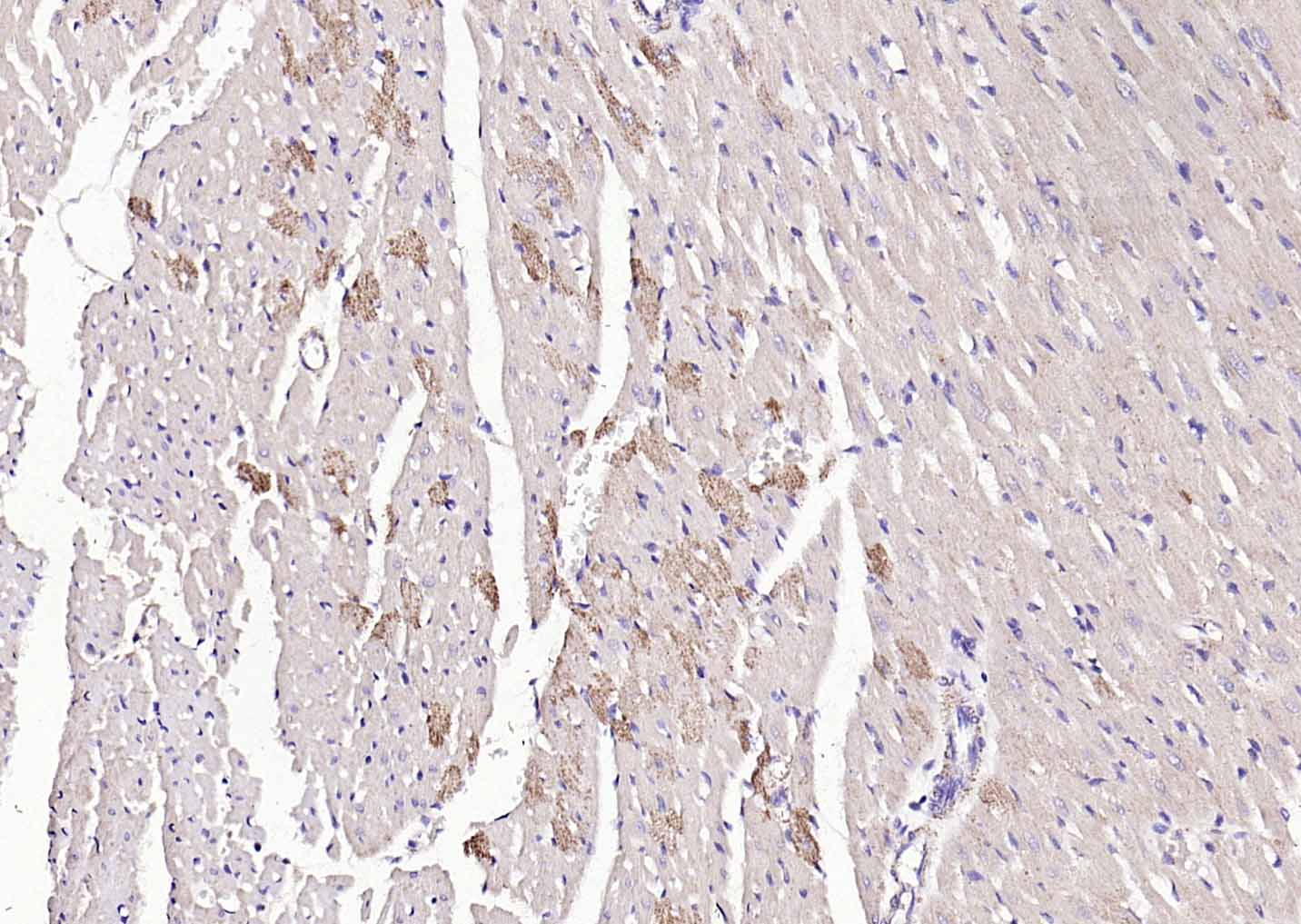 Paraformaldehyde-fixed, paraffin embedded (rat heart); Antigen retrieval by boiling in sodium citrate buffer (pH6.0) for 15min; Block endogenous peroxidase by 3% hydrogen peroxide for 20 minutes; Blocking buffer (normal goat serum) at 37°C for 30min; Antibody incubation with (Angiopoietin-1) Polyclonal Antibody, Unconjugated (bs-0800R) at 1:200 overnight at 4°C, followed by operating according to SP Kit(Rabbit) (sp-0023) instructionsand DAB staining.