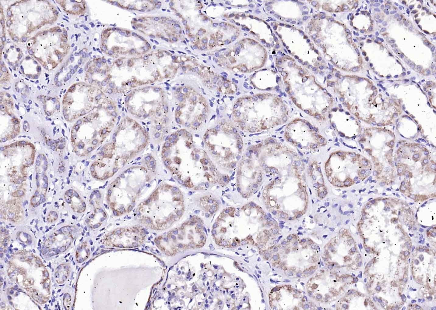 Paraformaldehyde-fixed, paraffin embedded (human kidney); Antigen retrieval by boiling in sodium citrate buffer (pH6.0) for 15min; Block endogenous peroxidase by 3% hydrogen peroxide for 20 minutes; Blocking buffer (normal goat serum) at 37°C for 30min; Antibody incubation with (Angiopoietin-1) Polyclonal Antibody, Unconjugated (bs-0800R) at 1:200 overnight at 4°C, followed by operating according to SP Kit(Rabbit) (sp-0023) instructionsand DAB staining.