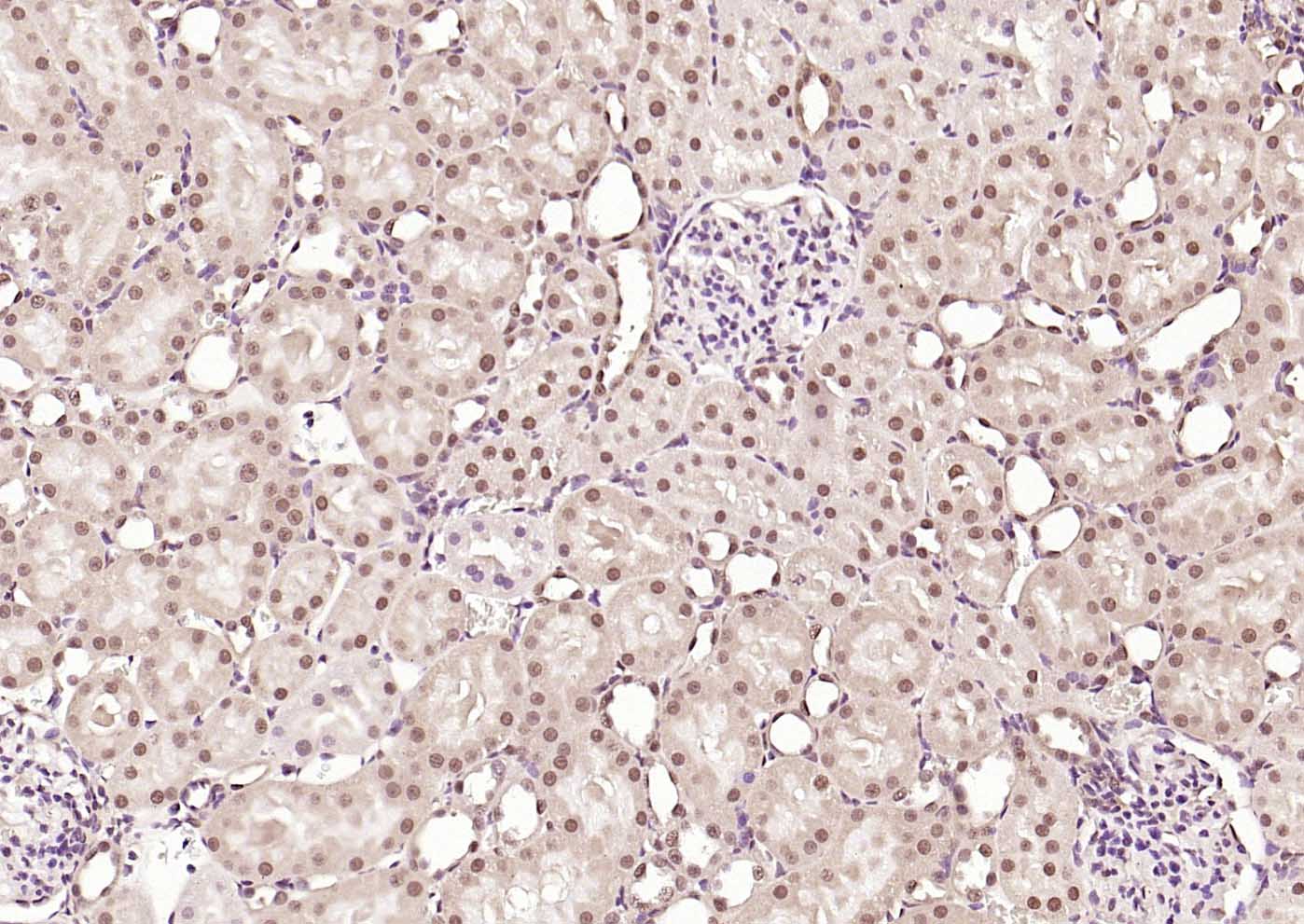 Paraformaldehyde-fixed, paraffin embedded (mouse kidney); Antigen retrieval by boiling in sodium citrate buffer (pH6.0) for 15min; Block endogenous peroxidase by 3% hydrogen peroxide for 20 minutes; Blocking buffer (normal goat serum) at 37°C for 30min; Incubation with (ATF2 ) Polyclonal Antibody, Unconjugated (bs-0518R) at 1:200 overnight at 4°C, followed by operating according to SP Kit(Rabbit) (sp-0023) instructionsand DAB staining.