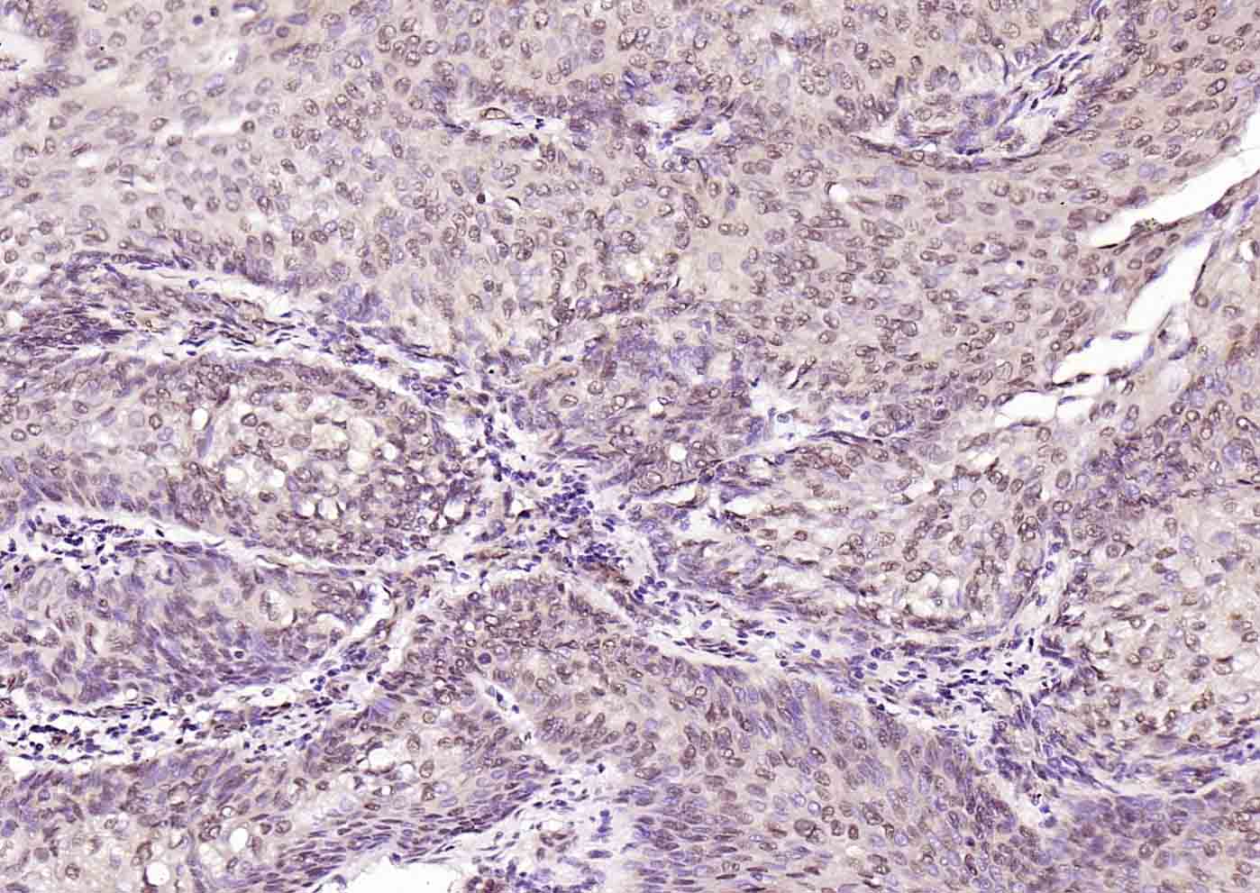 Paraformaldehyde-fixed, paraffin embedded (human breast carcinoma); Antigen retrieval by boiling in sodium citrate buffer (pH6.0) for 15min; Block endogenous peroxidase by 3% hydrogen peroxide for 20 minutes; Blocking buffer (normal goat serum) at 37°C for 30min; Incubation with (ATF2 ) Polyclonal Antibody, Unconjugated (bs-0518R) at 1:200 overnight at 4°C, followed by operating according to SP Kit(Rabbit) (sp-0023) instructionsand DAB staining.