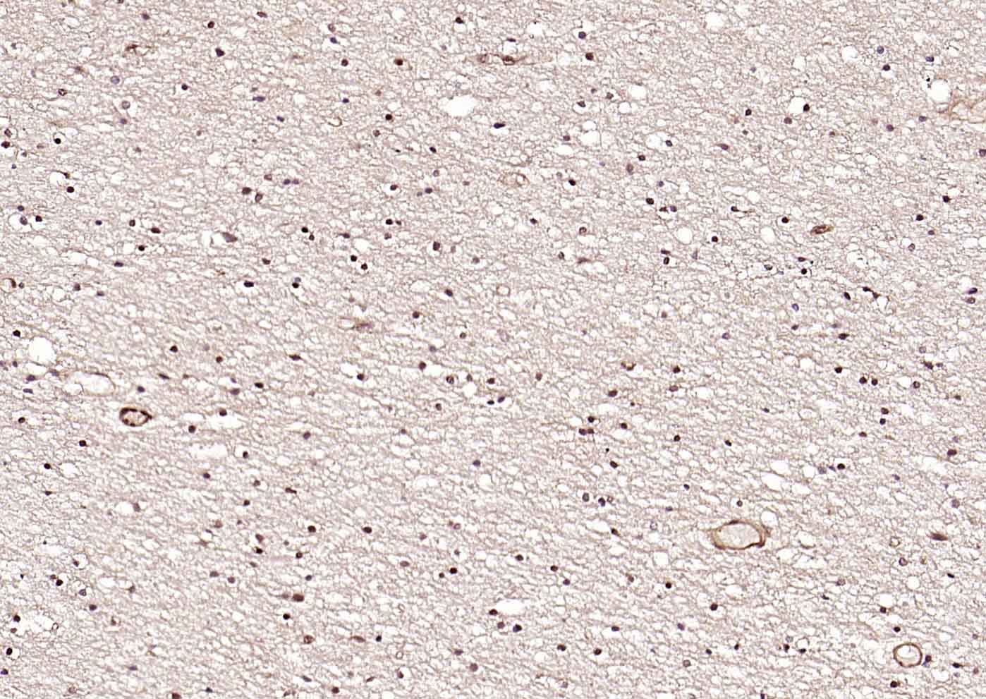 Paraformaldehyde-fixed, paraffin embedded (human brain); Antigen retrieval by boiling in sodium citrate buffer (pH6.0) for 15min; Block endogenous peroxidase by 3% hydrogen peroxide for 20 minutes; Blocking buffer (normal goat serum) at 37°C for 30min; Incubation with (ATF2 ) Polyclonal Antibody, Unconjugated (bs-0518R) at 1:200 overnight at 4°C, followed by operating according to SP Kit(Rabbit) (sp-0023) instructionsand DAB staining.