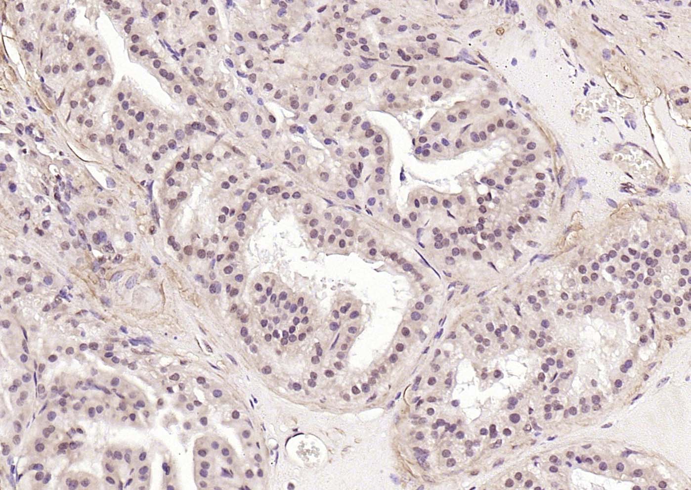 Paraformaldehyde-fixed, paraffin embedded (mouse prostate); Antigen retrieval by boiling in sodium citrate buffer (pH6.0) for 15min; Block endogenous peroxidase by 3% hydrogen peroxide for 20 minutes; Blocking buffer (normal goat serum) at 37°C for 30min; Incubation with (ATF2 ) Polyclonal Antibody, Unconjugated (bs-0518R) at 1:200 overnight at 4°C, followed by operating according to SP Kit(Rabbit) (sp-0023) instructionsand DAB staining.