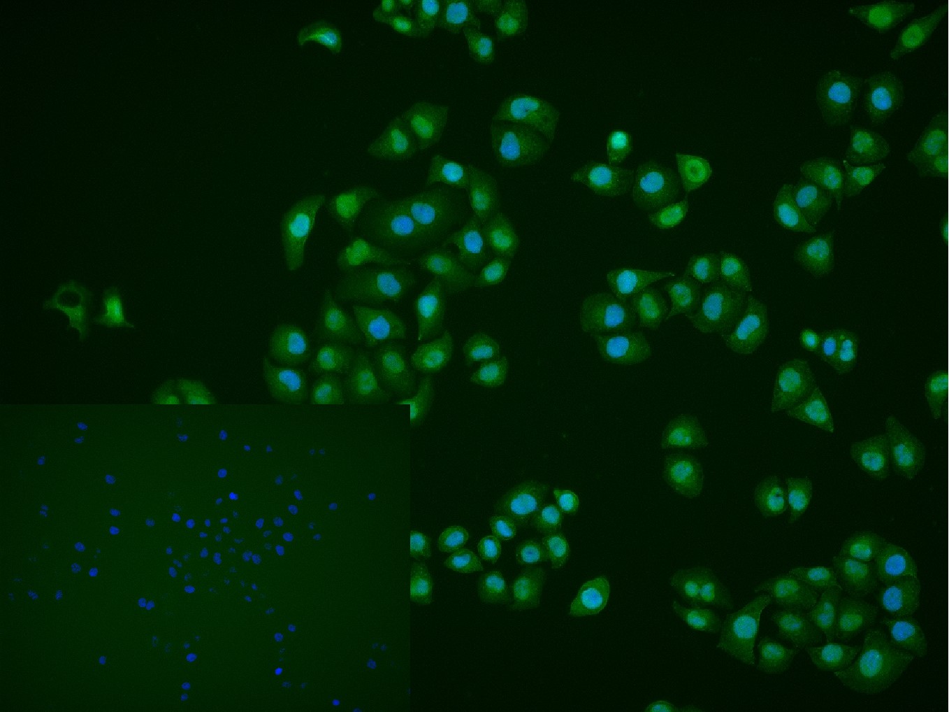 4% Paraformaldehyde-fixed Hela (H) cell; Triton X-100 at r.t. for 20 min; Antibody incubation with (ATF2) polyclonal Antibody, unconjugated (bs-0518R) 1:200, 90 min at 37°C; followed by conjugated Goat Anti-Rabbit IgG antibody (green, bs-60295G-FITC) at 37°C for 90 min, DAPI (blue, C02-04002) was used to stain the cell nuclei. PBS instead of the primary antibody was used as the blank control.