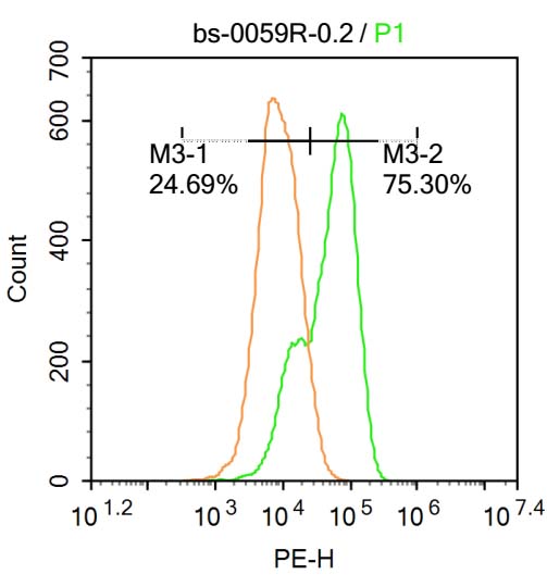 U-937 cells were fixed with 4% PFA for 10min at room temperature,permeabilized with 20% PBST for 20 min at room temperature, and incubated in 5% BSA blocking buffer for 30 min at room temperature. Cells were then stained with APAF1(NT) Antibody(bs-0059R)at 1:500 dilution in blocking buffer and incubated for 30 min at room temperature, washed twice with 2%BSA in PBS, followed by secondary antibody incubation for 40 min at room temperature. Acquisitions of 20,000 events were performed. Cells stained with primary antibody (green), and isotype control (orange).