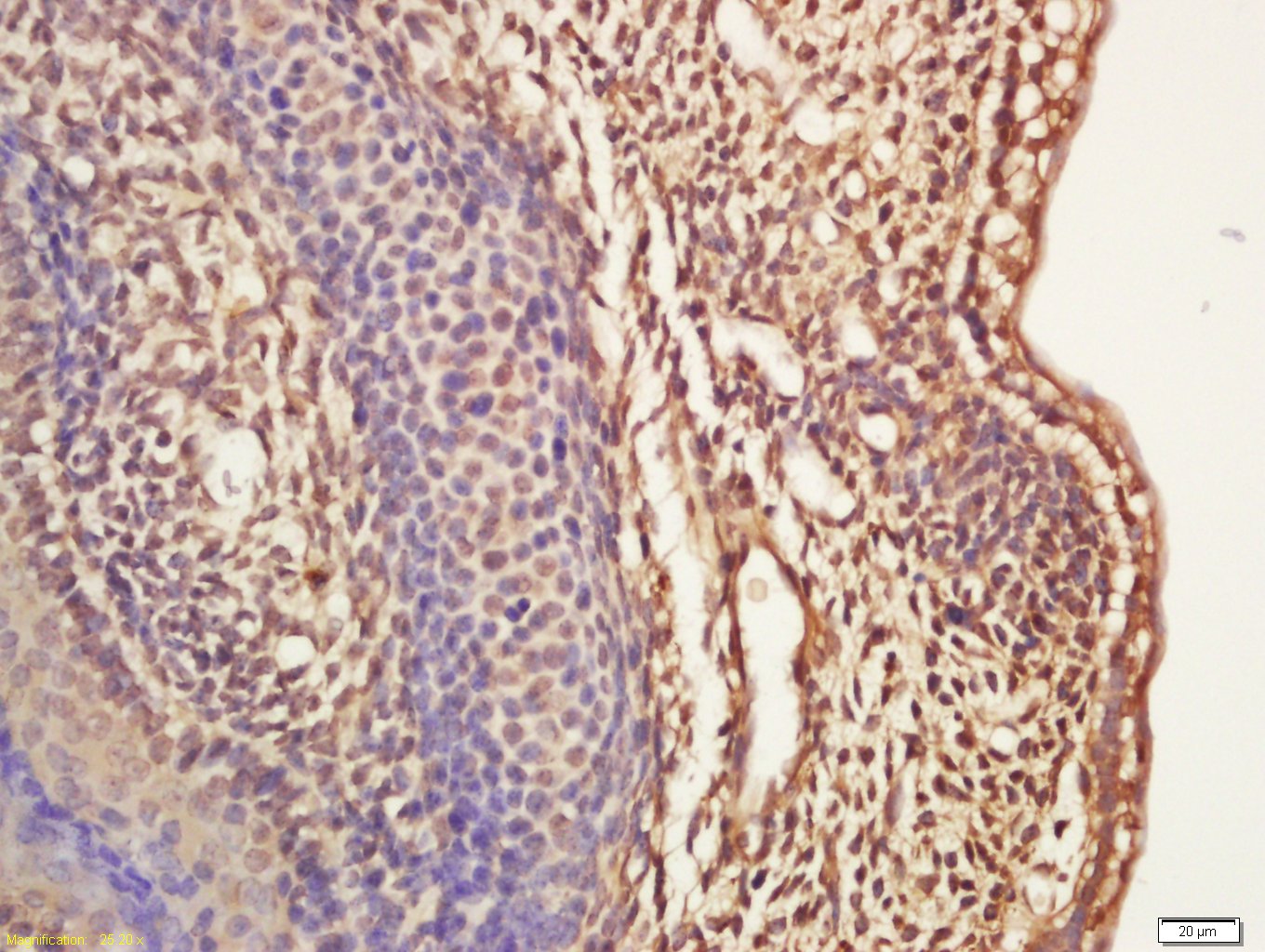 Antigen retrieval: citrate buffer ( 0.01M, pH 6.0 ), Boiling bathing for 15min; Block endogenous peroxidase by 3% Hydrogen peroxide for 30min; Blocking buffer (normal goat serum,C-0005) at 37℃ for 20 min;