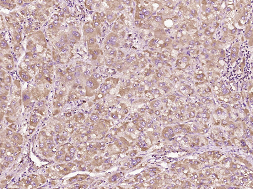 Paraformaldehyde-fixed, paraffin embedded (Human liver carcinoma); Antigen retrieval by boiling in sodium citrate buffer (pH6.0) for 15min; Block endogenous peroxidase by 3% hydrogen peroxide for 20 minutes; Blocking buffer (normal goat serum) at 37°C for 30min; Antibody incubation with (Bax) Polyclonal Antibody, Unconjugated (bs-0127R) at 1:400 overnight at 4°C, followed by operating according to SP Kit(Rabbit) (sp-0023) instructionsand DAB staining.