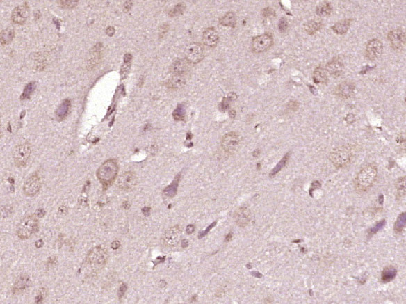 Paraformaldehyde-fixed, paraffin embedded (Mouse brain); Antigen retrieval by boiling in sodium citrate buffer (pH6.0) for 15min; Block endogenous peroxidase by 3% hydrogen peroxide for 20 minutes; Blocking buffer (normal goat serum) at 37°C for 30min; Antibody incubation with (ATP7A) Polyclonal Antibody, Unconjugated (bs-1572R) at 1:400 overnight at 4°C, followed by operating according to SP Kit(Rabbit) (sp-0023) instructionsand DAB staining.
