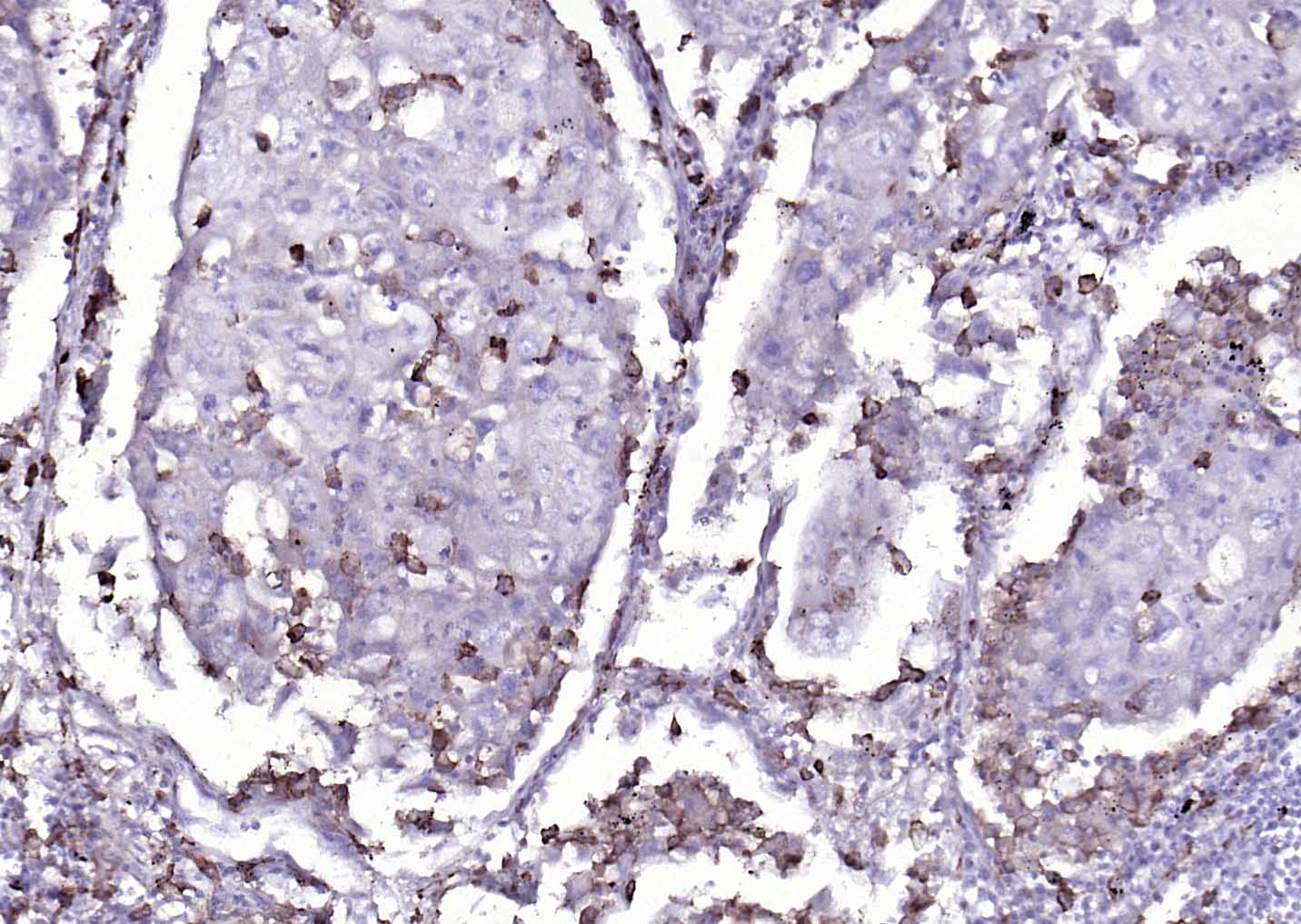 Paraformaldehyde-fixed, paraffin embedded (human lung carcinoma); Antigen retrieval by boiling in sodium citrate buffer (pH6.0) for 15min; Block endogenous peroxidase by 3% hydrogen peroxide for 20 minutes; Blocking buffer (normal goat serum) at 37°C for 30min; Antibody incubation with (CD14) Polyclonal Antibody, Unconjugated (bs-1192R) at 1:200 overnight at 4°C, followed by operating according to SP Kit(Rabbit) (sp-0023) instructionsand DAB staining.