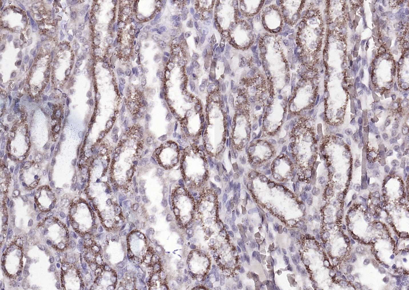 Paraformaldehyde-fixed, paraffin embedded (human kidney ); Antigen retrieval by boiling in sodium citrate buffer (pH6.0) for 15min; Block endogenous peroxidase by 3% hydrogen peroxide for 20 minutes; Blocking buffer (normal goat serum) at 37°C for 30min; Antibody incubation with (ATP7B) Polyclonal Antibody, Unconjugated (bs-1718R) at 1:200 overnight at 4°C, followed by operating according to SP Kit(Rabbit) (sp-0023) instructionsand DAB staining.