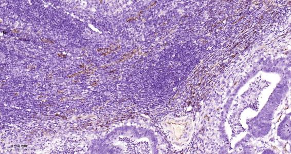 Paraformaldehyde-fixed, paraffin embedded Human colon cancer; Antigen retrieval by boiling in sodium citrate buffer (pH6.0) for 15 min; Antibody incubation with CD31 Polyclonal Antibody, Unconjugated(bs-0468R) at 1:200 overnight at 4°C, followed by conjugation to the bs-0295G-HRP and DAB (C-0010) staining.