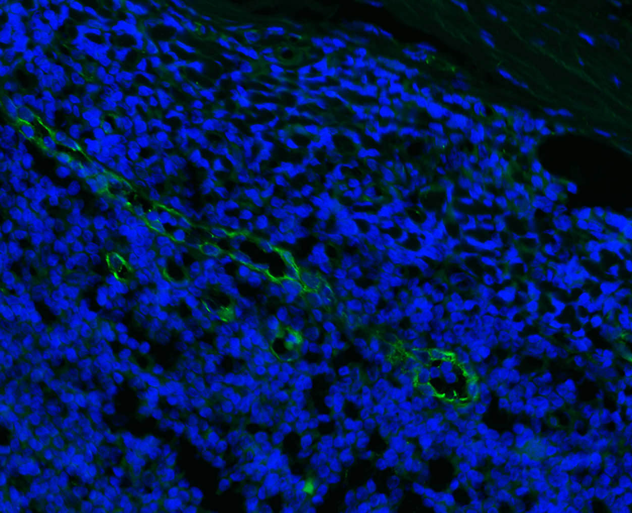 Paraformaldehyde-fixed, paraffin embedded (human tonsil); Antigen retrieval by boiling in sodium citrate buffer (pH6.0) for 15min; Blocking buffer (normal goat serum) at 37°C for 30min; Incubation with (CD31) Polyclonal Antibody, Unconjugated (bs-0195R) at 1:200 overnight at 4°C, followed by a conjugated Goat Anti-Rabbit IgG antibody (bs-0295G-AF488) for 90 minutes, and DAPI for nuclei staining.
