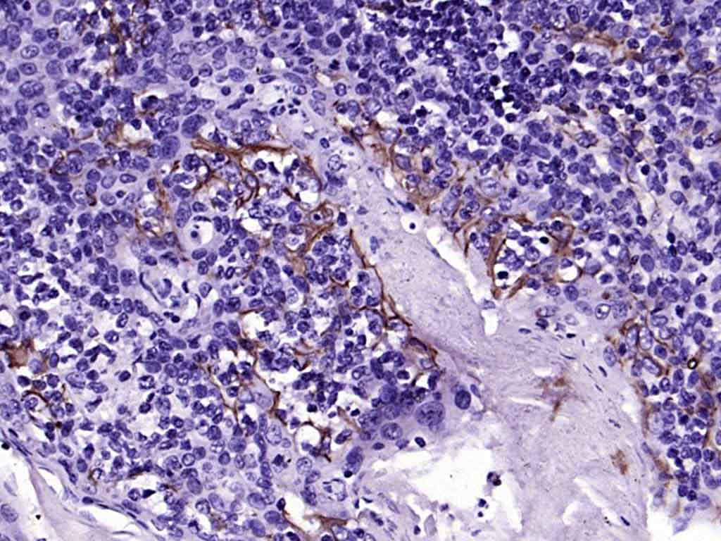 Paraformaldehyde-fixed, paraffin embedded Human Lung Cancer; Antigen retrieval by boiling in sodium citrate buffer (pH6.0) for 15 min; Antibody incubation with CD31 Polyclonal Antibody, Unconjugated (bs-0195R) at 1:200 overnight at 4°C, followed by conjugation to the bs-0295G-HRP and DAB (C-0010) staining.