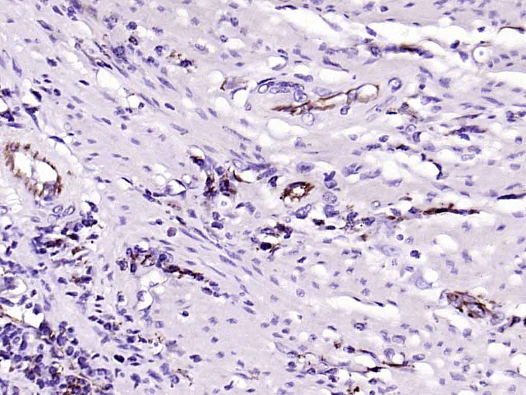 Paraformaldehyde-fixed, paraffin embedded (human colon carcinoma); Antigen retrieval by boiling in sodium citrate buffer (pH6.0) for 15min; Block endogenous peroxidase by 3% hydrogen peroxide for 20 minutes; Blocking buffer (normal goat serum) at 37°C for 30min; Antibody incubation with (CD31) Polyclonal Antibody, Unconjugated (bs-0195R ) at 1:200 overnight at 4°C, followed by operating according to SP Kit(Rabbit) (sp-0023) instructionsand DAB staining.