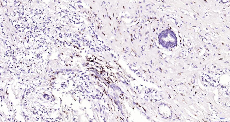 Paraformaldehyde-fixed, paraffin embedded Human Breast Cancer; Antigen retrieval by boiling in sodium citrate buffer (pH6.0) for 15 min; Antibody incubation with CD45 Polyclonal Antibody, Unconjugated (bs-0522R) at 1:200 overnight at 4°C, followed by conjugation to the bs-0295G-HRP and DAB (C-0010) staining.