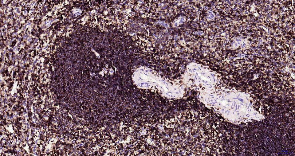 Paraformaldehyde-fixed, paraffin embedded Human Spleen; Antigen retrieval by boiling in sodium citrate buffer (pH6.0) for 15 min; Antibody incubation with CD45 Polyclonal Antibody, Unconjugated (bs-0522R) at 1:200 overnight at 4°C, followed by conjugation to the bs-0295G-HRP and DAB (C-0010) staining.