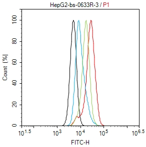 Blank control (black line): HepG2(black) (The cells were fixed with 2% paraformaldehyde (10 min) , then permeabilized with PBST for 30 min on room temperature)