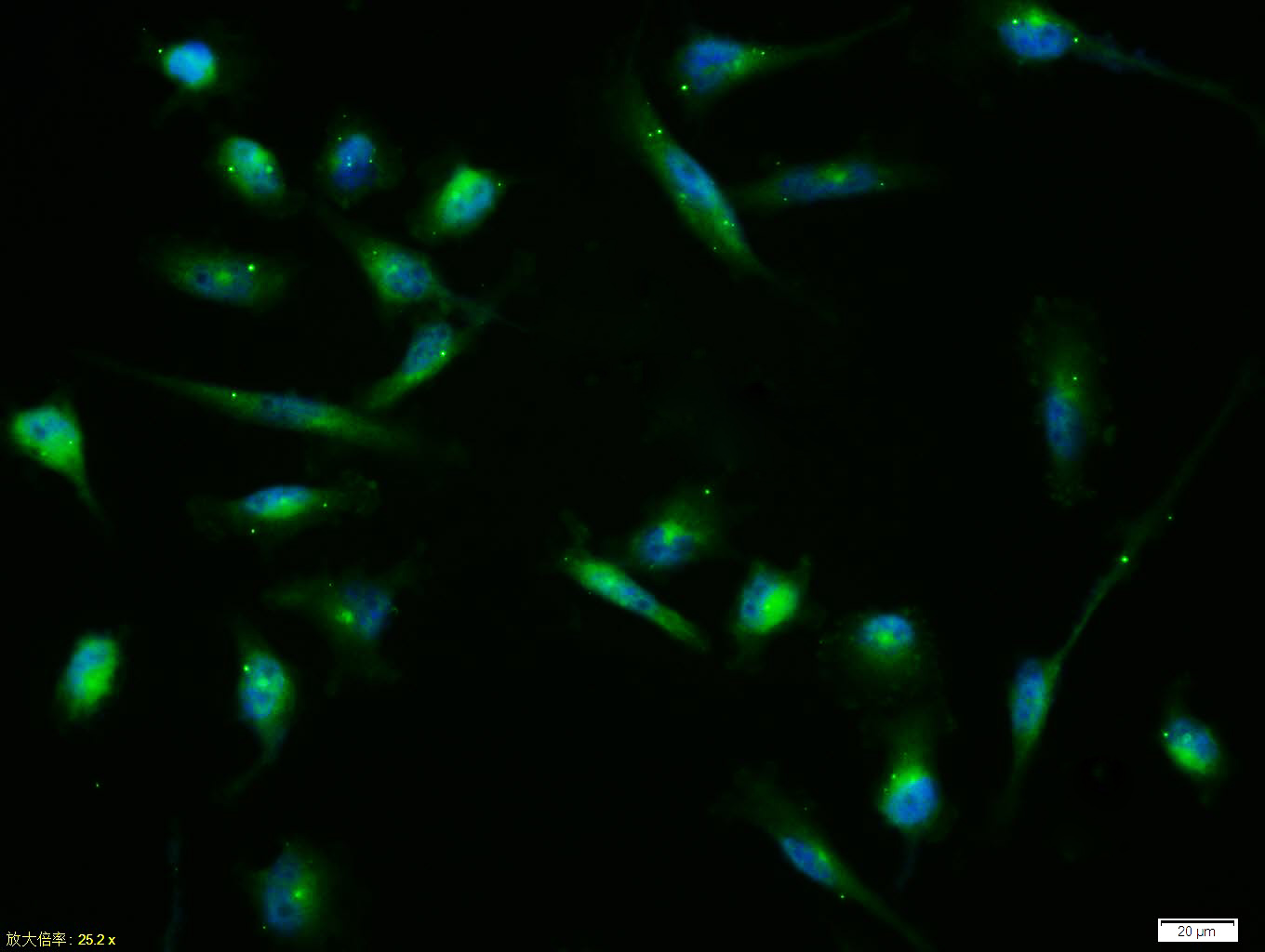Tissue/cell:U-251 cell; 4% Paraformaldehyde-fixed; Triton X-100 at room temperature for 20 min; Blocking buffer (normal goat serum, C-0005) at 37°C for 20 min; Antibody incubation with (Connexin 43) polyclonal Antibody, Unconjugated (bs-0651R) 1:100, 90 minutes at 37°C; followed by a FITC conjugated Goat Anti-Rabbit IgG antibody at 37°C for 90 minutes, DAPI (blue, C02-04002) was used to stain the cell nuclei.