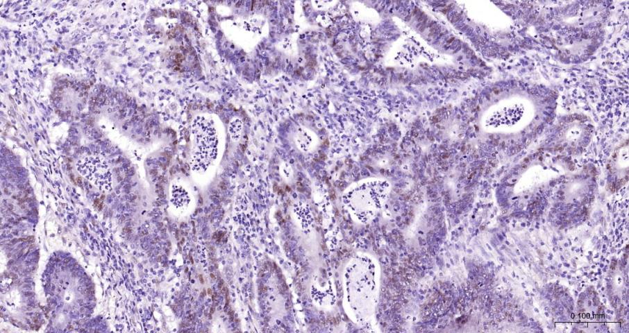 Paraformaldehyde-fixed, paraffin embedded Human Colon Cancer; Antigen retrieval by boiling in sodium citrate buffer (pH6.0) for 15 min; Antibody incubation with Cyclin D1 Polyclonal Antibody, Unconjugated (bs-0623R) at 1:200 overnight at 4°C, followed by conjugation to the bs-0295G-HRP and DAB (C-0010) staining.