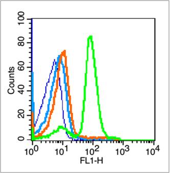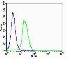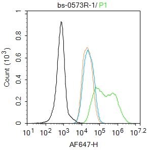 Flow cytometric analysis of primary antibody (Cat#: bs-0573R) on NIH/3T3(green) compared with Rabbit IgG isotype control in the absence of primary antibody (blue) followed by Alexa Fluor 488-conjugated goat anti-rabbit IgG(H+L) secondary antibody .