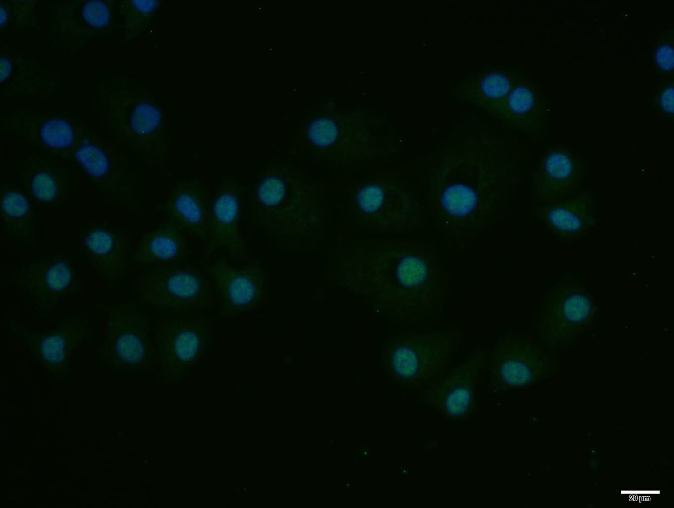 HepG2 cell; 4% Paraformaldehyde-fixed; Triton X-100 at room temperature for 20 min; Blocking buffer (normal goat serum, C-0005) at 37°C for 20 min; Antibody incubation with (E2F1) polyclonal Antibody, Unconjugated (bs-0599R) 1:100, 90 minutes at 37°C; followed by a conjugated Goat Anti-Rabbit IgG antibody at 37°C for 90 minutes, DAPI (blue, C02-04002) was used to stain the cell nuclei.