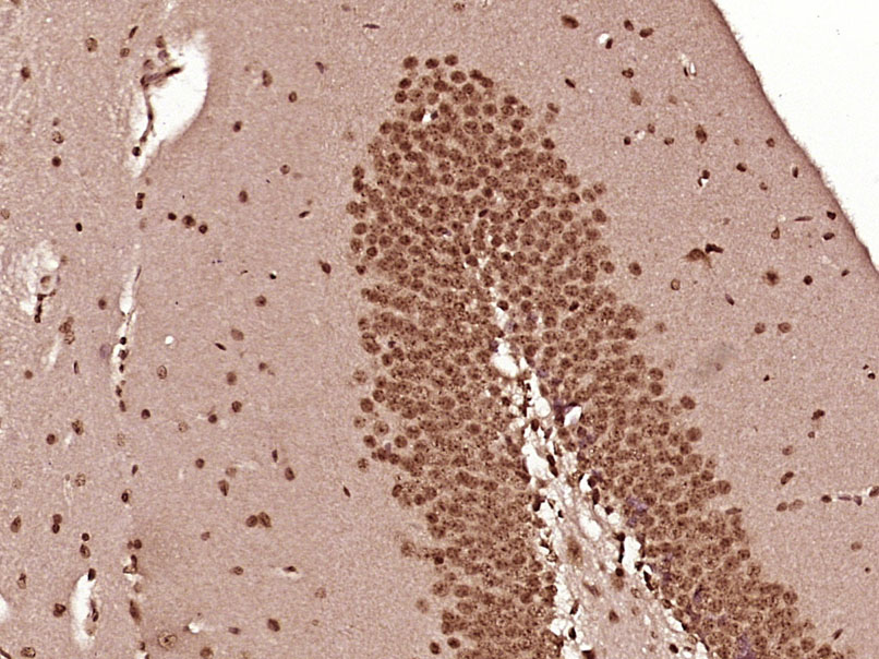 Paraformaldehyde-fixed, paraffin embedded (Mouse brain); Antigen retrieval by boiling in sodium citrate buffer (pH6.0) for 15min; Block endogenous peroxidase by 3% hydrogen peroxide for 20 minutes; Blocking buffer (normal goat serum) at 37°C for 30min; Antibody incubation with (E2F1) Polyclonal Antibody, Unconjugated (bs-0599R) at 1:400 overnight at 4°C, followed by operating according to SP Kit(Rabbit) (sp-0023) instructionsand DAB staining.