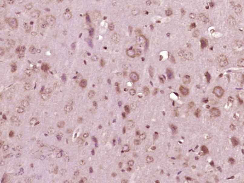 Paraformaldehyde-fixed, paraffin embedded (Mouse brain); Antigen retrieval by boiling in sodium citrate buffer (pH6.0) for 15min; Block endogenous peroxidase by 3% hydrogen peroxide for 20 minutes; Blocking buffer (normal goat serum) at 37°C for 30min; Antibody incubation with (FGFR1) Polyclonal Antibody, Unconjugated (bs-0230R) at 1:400 overnight at 4°C, followed by operating according to SP Kit(Rabbit) (sp-0023) instructionsand DAB staining.