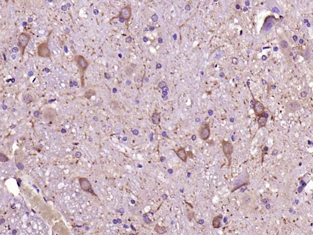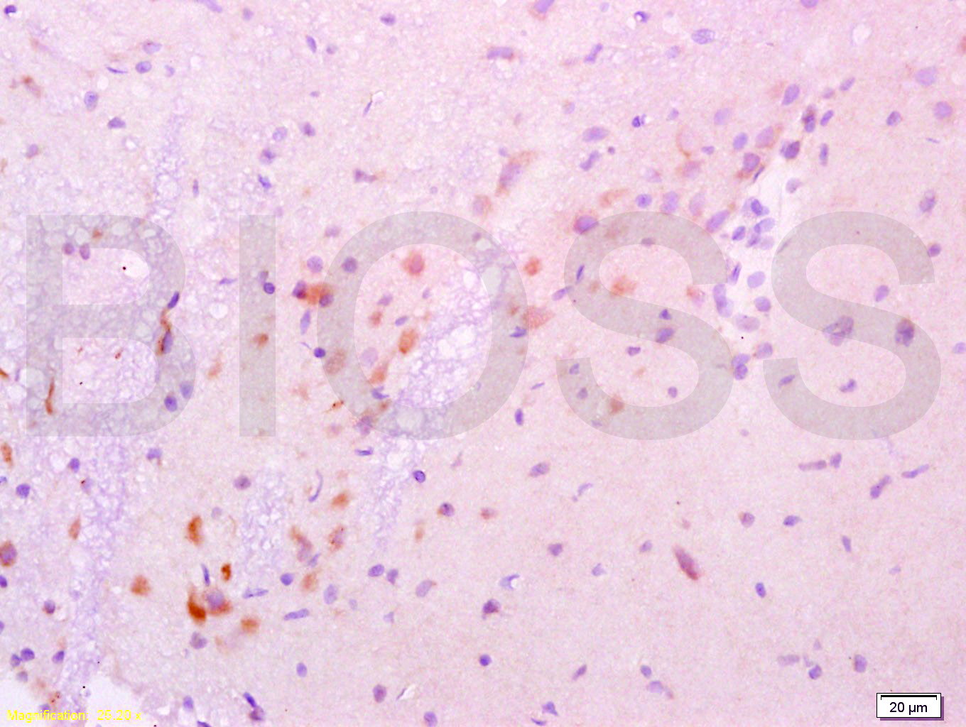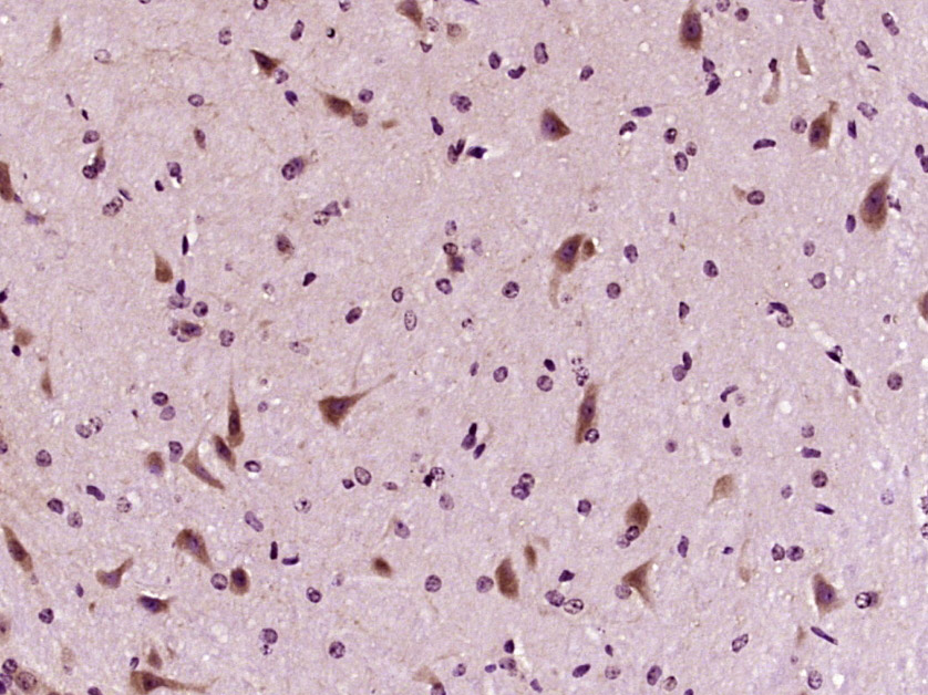 Paraformaldehyde-fixed, paraffin embedded (Mouse brain); Antigen retrieval by boiling in sodium citrate buffer (pH6.0) for 15min; Block endogenous peroxidase by 3% hydrogen peroxide for 20 minutes; Blocking buffer (normal goat serum) at 37°C for 30min; Antibody incubation with (GDNF) Polyclonal Antibody, Unconjugated (bs-1024R) at 1:400 overnight at 4°C, followed by operating according to SP Kit(Rabbit) (sp-0023) instructionsand DAB staining.