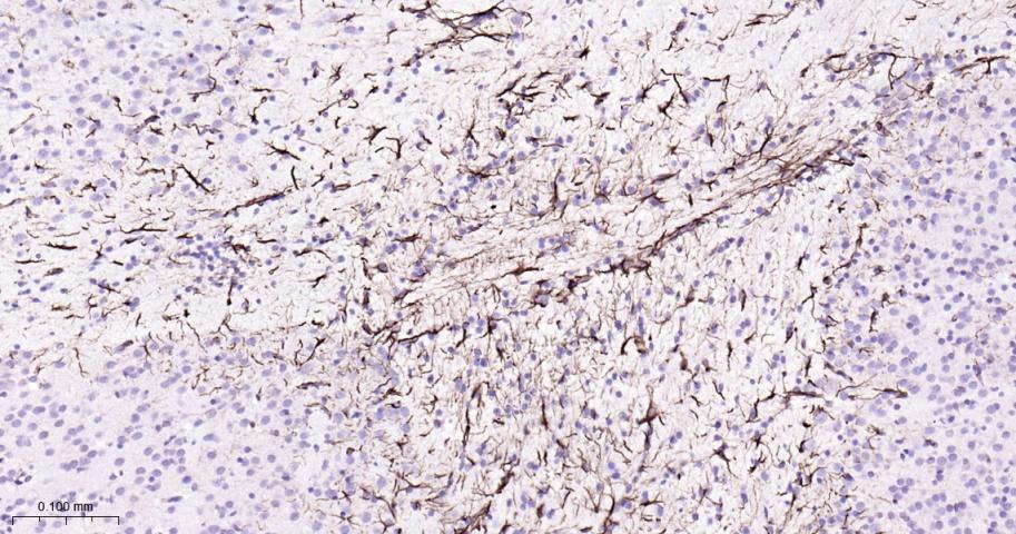 Paraformaldehyde-fixed, paraffin embedded Mouse Cerebrum; Antigen retrieval by boiling in sodium citrate buffer (pH6.0) for 15 min; The section was incubated with GFAP Polyclonal Antibody, Unconjugated (bs-0199R) at 1:200 overnight at 4°C, followed by conjugation to the bs-0295G-HRP and DAB (C-0010) staining.
