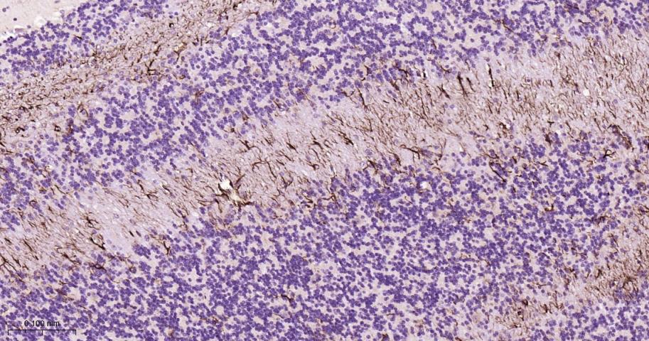 Paraformaldehyde-fixed, paraffin embedded Mouse Cerebellum; Antigen retrieval by boiling in sodium citrate buffer (pH6.0) for 15 min; The section was incubated with GFAP Polyclonal Antibody, Unconjugated (bs-0199R) at 1:200 overnight at 4°C, followed by conjugation to the bs-0295G-HRP and DAB (C-0010) staining.