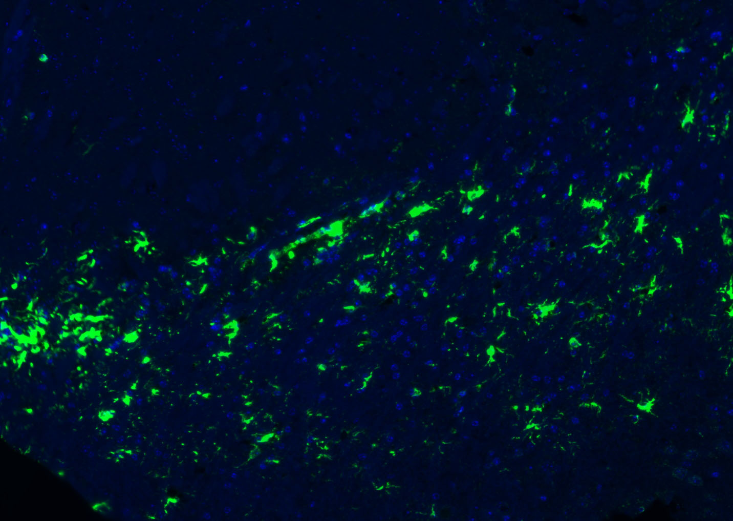 Paraformaldehyde-fixed, paraffin embedded (mouse brain); Antigen retrieval by boiling in sodium citrate buffer (pH6.0) for 15min; Blocking buffer (normal goat serum) at 37°C for 30min; Antibody incubation with (GFAP) Polyclonal Antibody, Unconjugated (bs-0199R) at 1:500 overnight at 4°C, followed by a conjugated Goat Anti-Rabbit IgG antibody (YF488) for 90 minutes, and DAPI for nuclei staining.