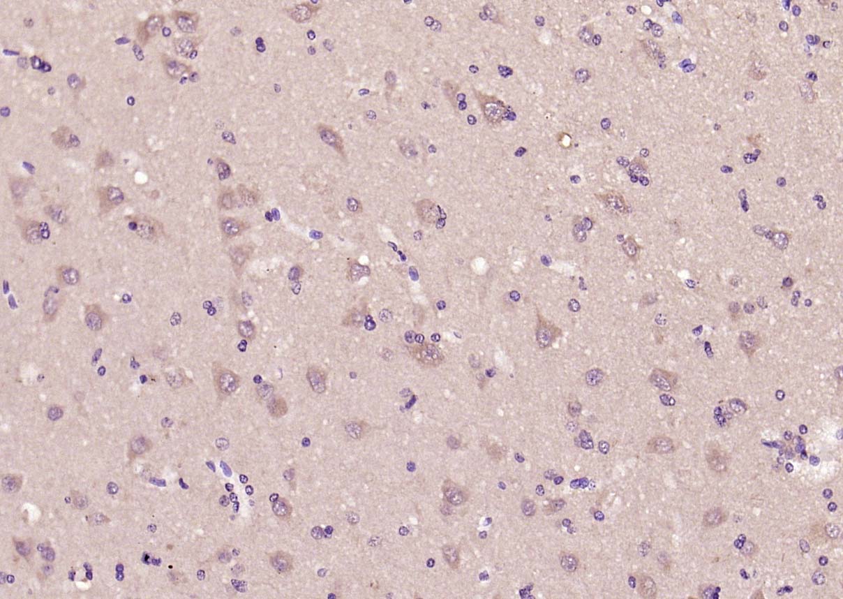 Paraformaldehyde-fixed, paraffin embedded (human brain); Antigen retrieval by boiling in sodium citrate buffer (pH6.0) for 15min; Block endogenous peroxidase by 3% hydrogen peroxide for 20 minutes; Blocking buffer (normal goat serum) at 37°C for 30min; Antibody incubation with (GLP-2) Polyclonal Antibody, Unconjugated (bs-0208R) at 1:200 overnight at 4°C, followed by operating according to SP Kit(Rabbit) (sp-0023) instructionsand DAB staining.