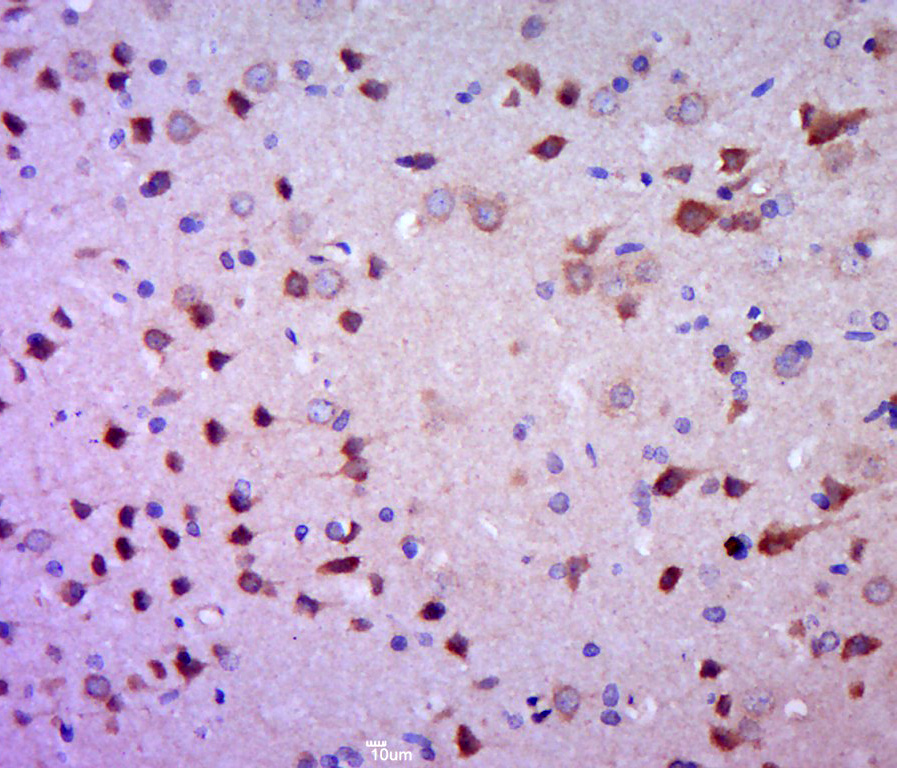 Paraformaldehyde-fixed, paraffin embedded (rat brain); Antigen retrieval by boiling in sodium citrate buffer (pH6.0) for 15min; Block endogenous peroxidase by 3% hydrogen peroxide for 20 minutes; Blocking buffer (normal goat serum) at 37°C for 30min; Antibody incubation with (Glucocorticoid receptor) Polyclonal Antibody, Unconjugated (bs-0252R) at 1:200 overnight at 4°C, followed by operating according to SP Kit(Rabbit) (sp-0023) instructionsand DAB staining.