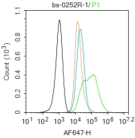 Flow cytometric analysis of primary antibody (Cat#: bs-0252R) on H-4-II-E(green) compared with control in the absence of primary antibody (blue) followed by Alexa Fluor 488-conjugated goat anti-rabbit IgG(H+L) secondary antibody .