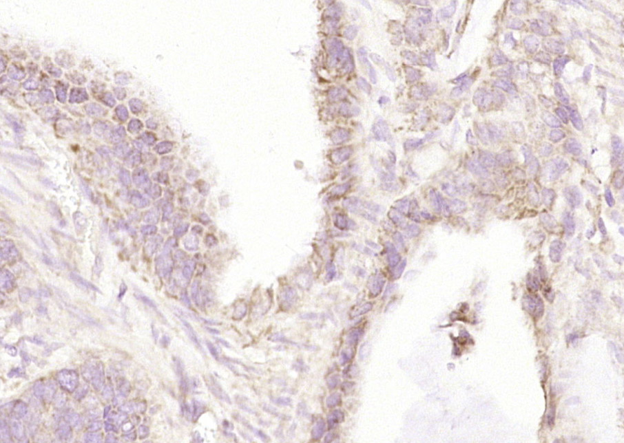Paraformaldehyde-fixed, paraffin embedded (human endometrial carcinoma); Antigen retrieval by boiling in sodium citrate buffer (pH6.0) for 15min; Block endogenous peroxidase by 3% hydrogen peroxide for 20 minutes; Blocking buffer (normal goat serum) at 37°C for 30min; Antibody incubation with (IFN-Beta/Ifnb1) Polyclonal Antibody, Unconjugated (bs-0787R) at 1:200 overnight at 4°C, followed by operating according to SP Kit(Rabbit) (sp-0023) instructionsand DAB staining.