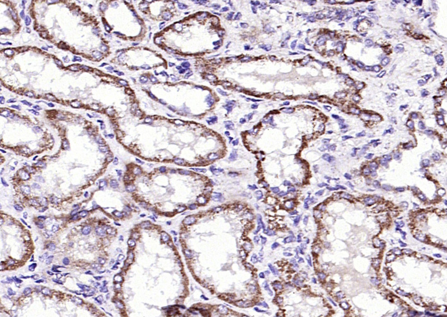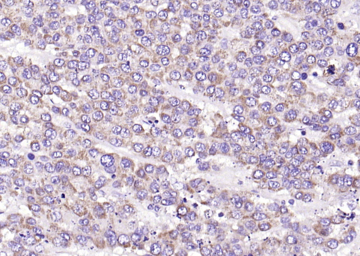 Paraformaldehyde-fixed, paraffin embedded (human kidney carcinoma); Antigen retrieval by boiling in sodium citrate buffer (pH6.0) for 15min; Block endogenous peroxidase by 3% hydrogen peroxide for 20 minutes; Blocking buffer (normal goat serum) at 37°C for 30min; Antibody incubation with (IFN-Beta) Polyclonal Antibody, Unconjugated (bs-0787R) at 1:200 overnight at 4°C, followed by operating according to SP Kit(Rabbit) (sp-0023) instructionsand DAB staining.