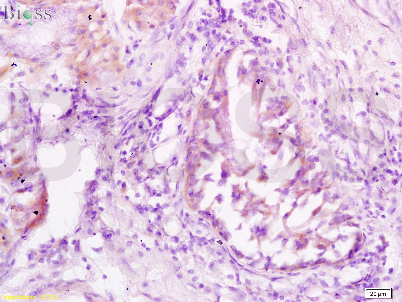 Paraformaldehyde-fixed, paraffin embedded (human gastric carcinoma); Antigen retrieval by boiling in sodium citrate buffer (pH6.0) for 15min; Block endogenous peroxidase by 3% hydrogen peroxide for 20 minutes; Blocking buffer (normal goat serum) at 37°C for 30min; Antibody incubation with (JNK1 + JNK3) Polyclonal Antibody, Unconjugated (bs-0501R) at 1:200 overnight at 4°C, followed by operating according to SP Kit(Rabbit) (sp-0023) instructionsand DAB staining.