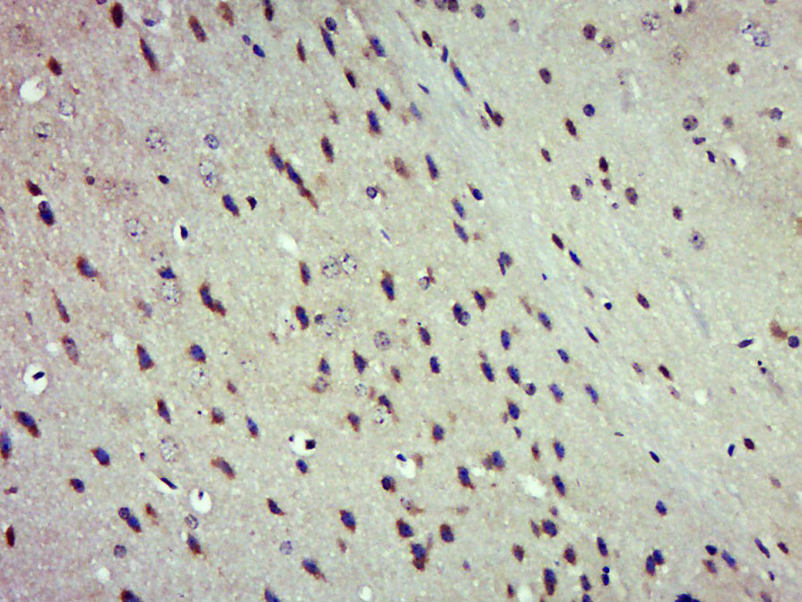Paraformaldehyde-fixed, paraffin embedded (Mouse brain); Antigen retrieval by boiling in sodium citrate buffer (pH6.0) for 15min; Block endogenous peroxidase by 3% hydrogen peroxide for 20 minutes; Blocking buffer (normal goat serum) at 37°C for 30min; Antibody incubation with (JNK1 + JNK3) Polyclonal Antibody, Unconjugated (bs-0501R) at 1:500 overnight at 4°C, followed by a conjugated secondary (sp-0023) for 20 minutes and DAB staining.