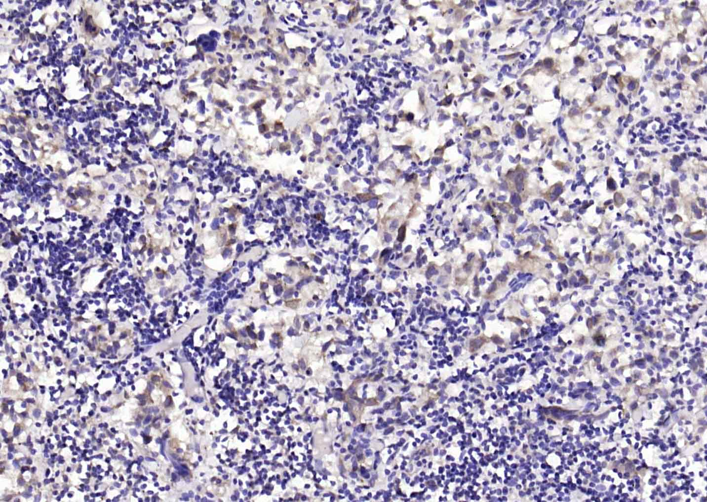 Paraformaldehyde-fixed, paraffin embedded (human gastric carcinoma); Antigen retrieval by boiling in sodium citrate buffer (pH6.0) for 15min; Block endogenous peroxidase by 3% hydrogen peroxide for 20 minutes; Blocking buffer (normal goat serum) at 37°C for 30min; Antibody incubation with (KRAS) Polyclonal Antibody, Unconjugated (bs-1033R) at 1:200 overnight at 4°C, followed by operating according to SP Kit(Rabbit) (sp-0023) instructionsand DAB staining.