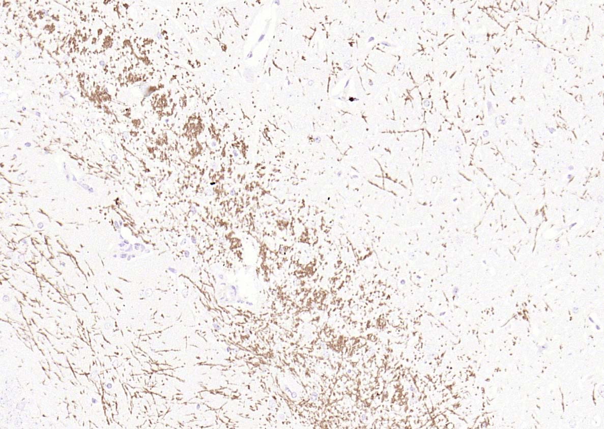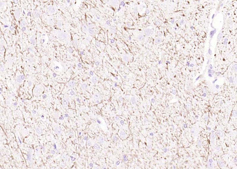 Paraformaldehyde-fixed, paraffin embedded Human Cerebrum; Antigen retrieval by boiling in sodium citrate buffer (pH6.0) for 15 min; Antibody incubation with MBP Polyclonal Antibody, Unconjugated (bs-0380R) at 1:200 overnight at 4°C, followed by conjugation to the SP Kit (Rabbit, SP-0023) and DAB (C-0010) staining.