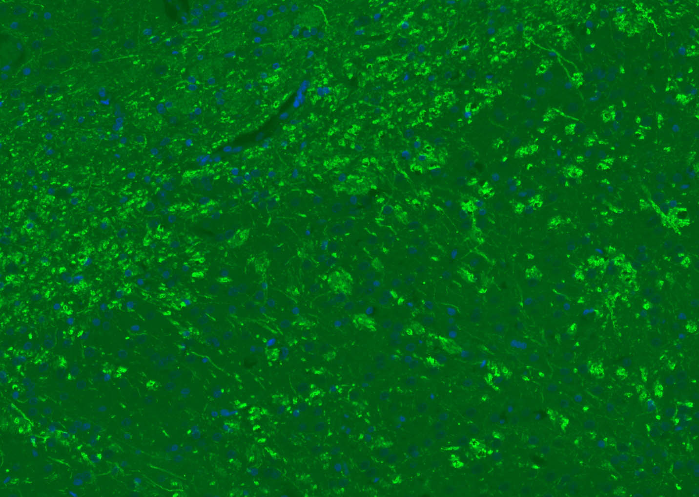 Paraformaldehyde-fixed, paraffin embedded Human Cerebrum; Antigen retrieval by boiling in sodium citrate buffer (pH6.0) for 15 min; Antibody incubation with MBP Polyclonal Antibody, Unconjugated (bs-0380R) at 1:200 overnight at 4°C. Followed by conjugated Goat Anti-Rabbit IgG antibody (green, bs-0295G-BF488), DAPI (blue, C02-04002) was used to stain the cell nuclei.
