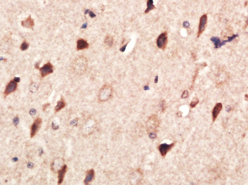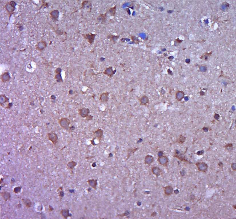 Paraformaldehyde-fixed, paraffin embedded (Rat brain); Antigen retrieval by boiling in sodium citrate buffer (pH6.0) for 15min; Block endogenous peroxidase by 3% hydrogen peroxide for 20 minutes; Blocking buffer (normal goat serum) at 37°C for 30min; Antibody incubation with (MMP2) Polyclonal Antibody, Unconjugated (bs-0412R) at 1:400 overnight at 4°C, followed by operating according to SP Kit(Rabbit) (sp-0023) instructions and DAB staining.