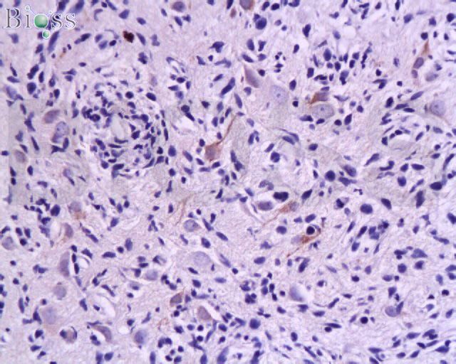 Paraformaldehyde-fixed, paraffin embedded Human Glioma; Antigen retrieval by boiling in sodium citrate buffer (pH6.0) for 15 min; Antibody incubation with MMP2 Polyclonal Antibody, Unconjugated (bs-0412R) at 1:400 overnight at 4°C, followed by conjugation to the SP Kit (Rabbit, SP-0023) and DAB (C-0010) staining.