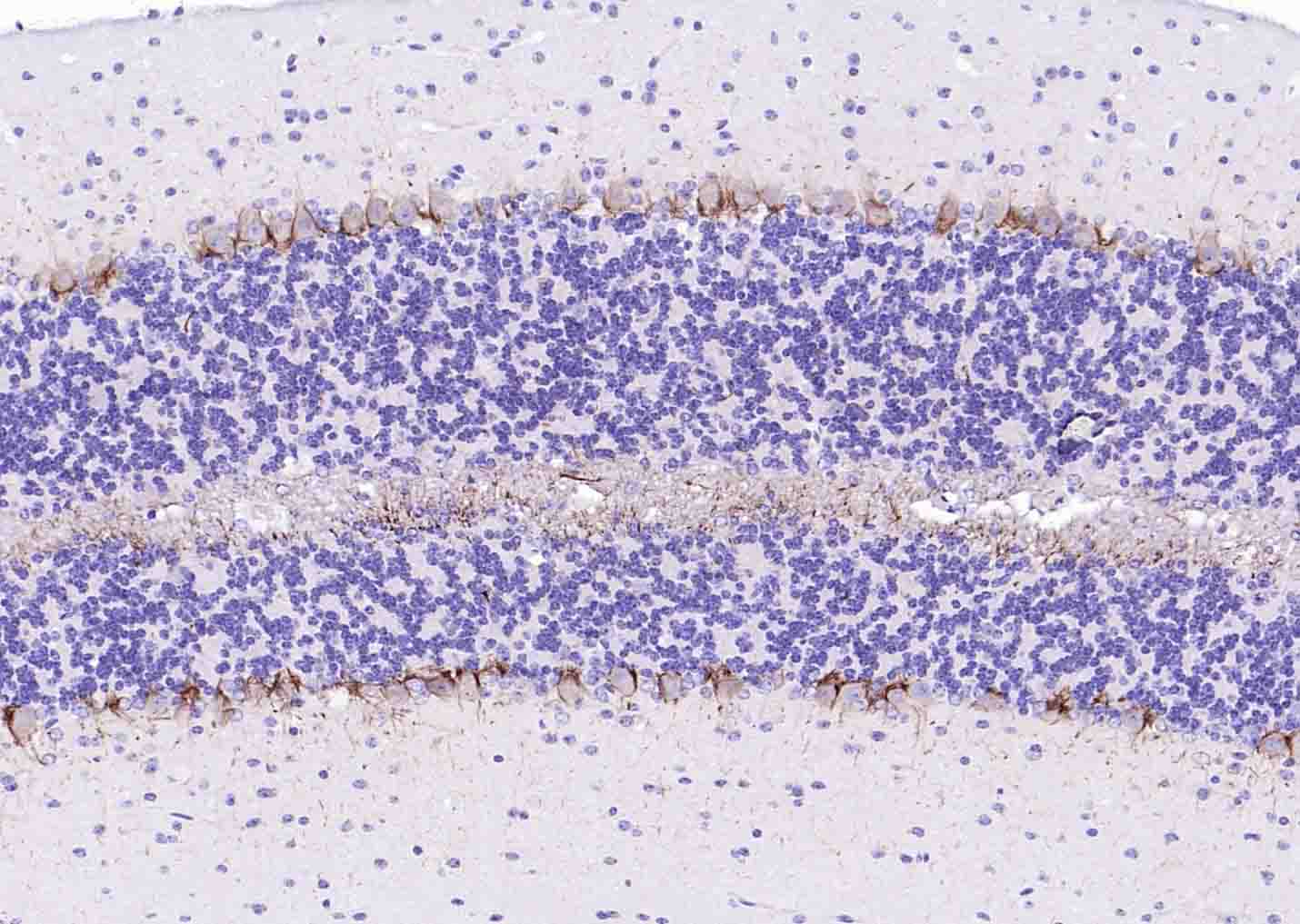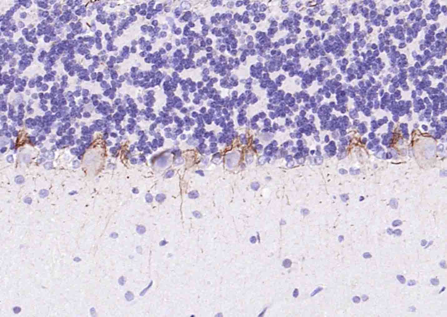 Paraformaldehyde-fixed, paraffin embedded (mouse cerebellum); Antigen retrieval by boiling in sodium citrate buffer (pH6.0) for 15min; Block endogenous peroxidase by 3% hydrogen peroxide for 20 minutes; Blocking buffer (normal goat serum) at 37°C for 30min; Antibody incubation with (NF-H) Polyclonal Antibody, Unconjugated (bs-0708R) at 1:200 overnight at 4°C, followed by operating according to SP Kit(Rabbit) (sp-0023) instructionsand DAB staining.